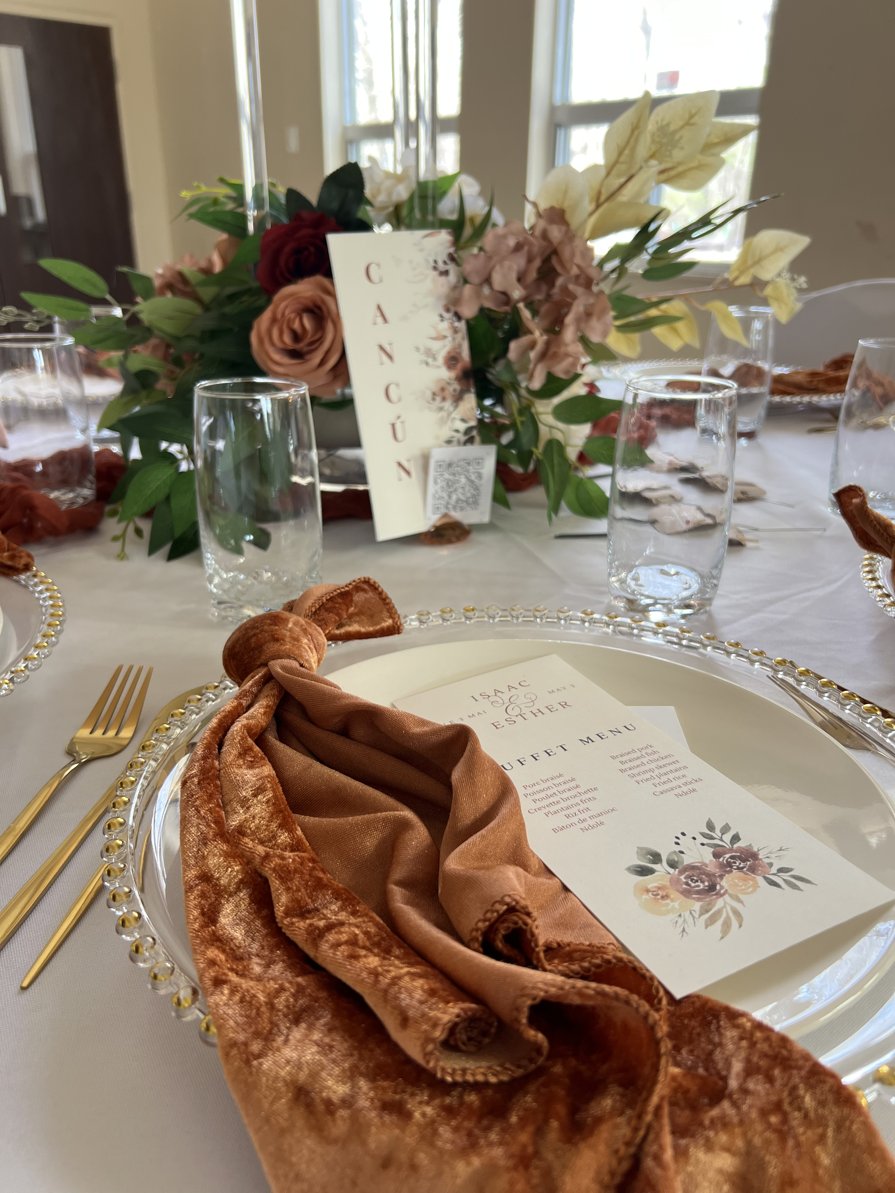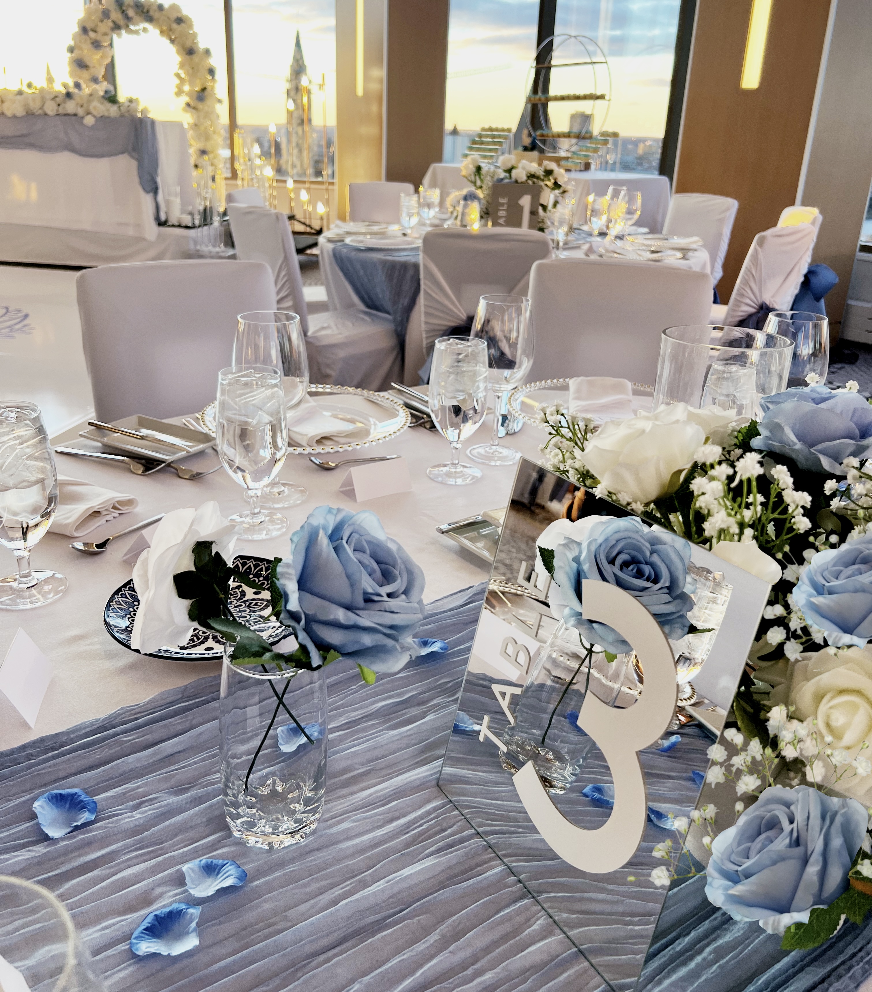 Tablescape at S & A’s wedding at Venue Twenty Two. We love the dusty blue theme with mirrored table numbers!