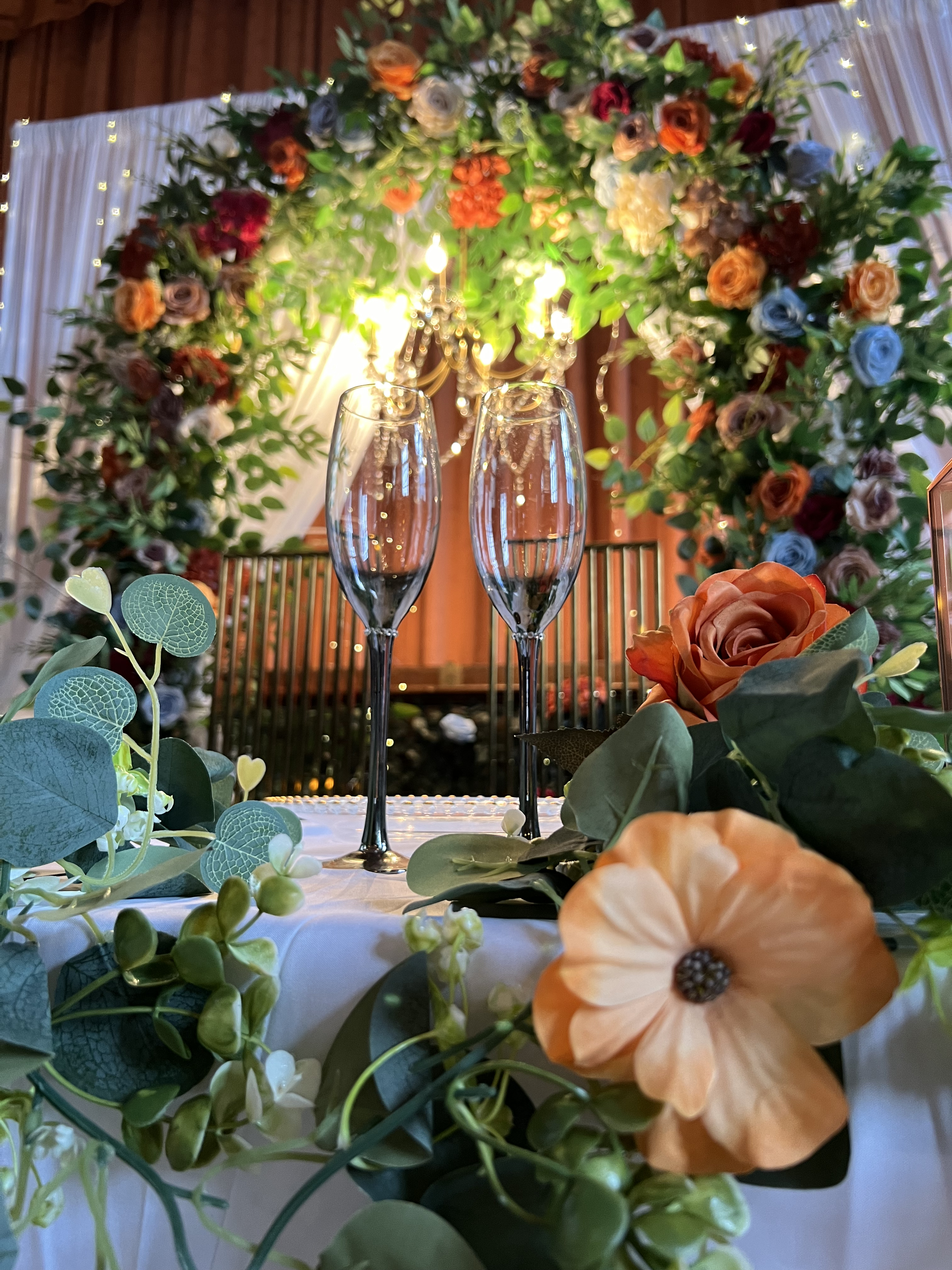 Part of a backyard wedding in Barrhaven. A mix of white florals and gold accents tied together with our luxe white loveseat for the perfect reception stage decor.